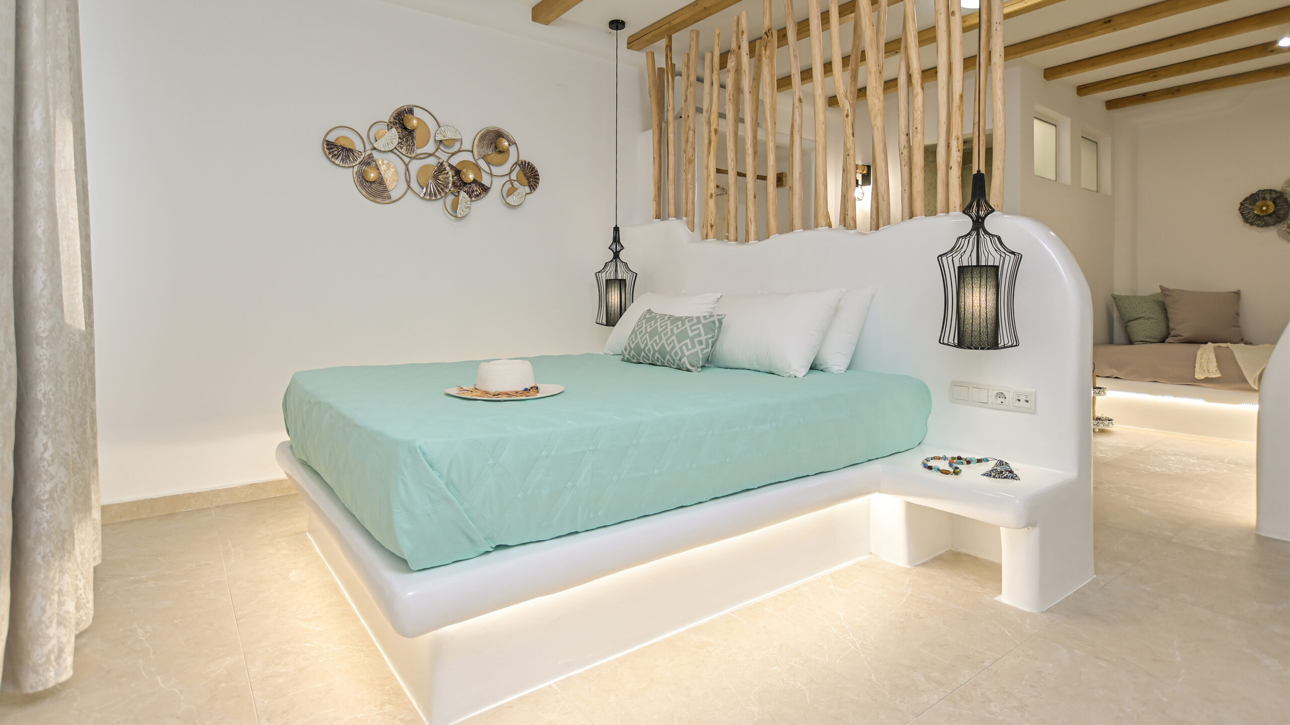 The Family Suite has been designed to offer modern comfort and unique amenities, ensuring that those who choose it have the opportunity to relax and enjoy a magical vacation. This suite offers two bedrooms and can accommodate up to 4 people. The first bedroom has a king size bed in a fairly spacious environment, while the second bedroom has two semi-double beds. The bathroom of the suite has a stone sink and a spacious shower in a special style. The deluxe apartment has its own furnished private terrace that offers unrestricted views of the magnificent landscape of the salt flats where in the afternoon you can enjoy the sunset.